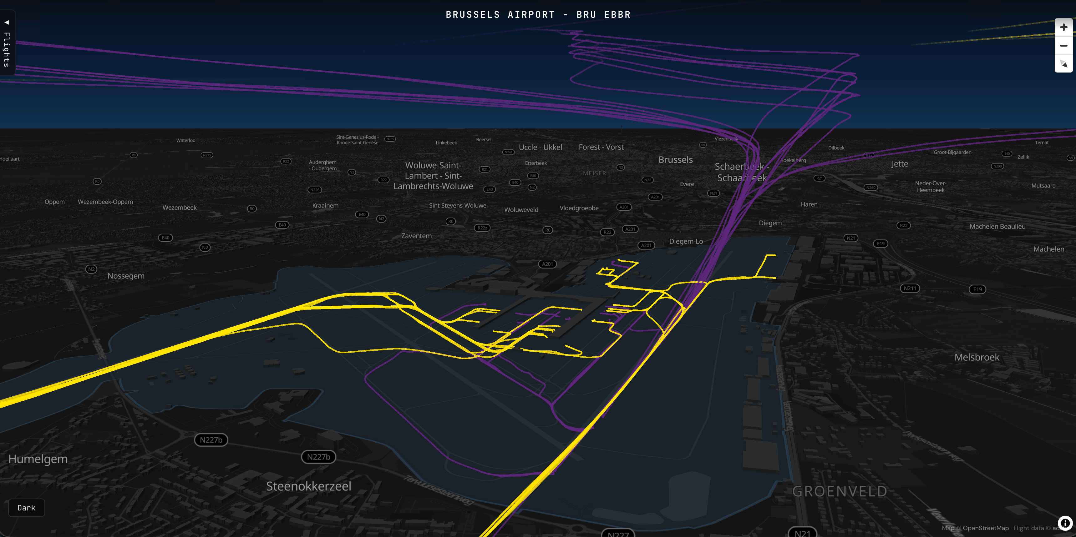 A live 3D visualization of air traffic around Brussels Airport, built from real-time ADS-B data showing departures, arrivals and overflights.