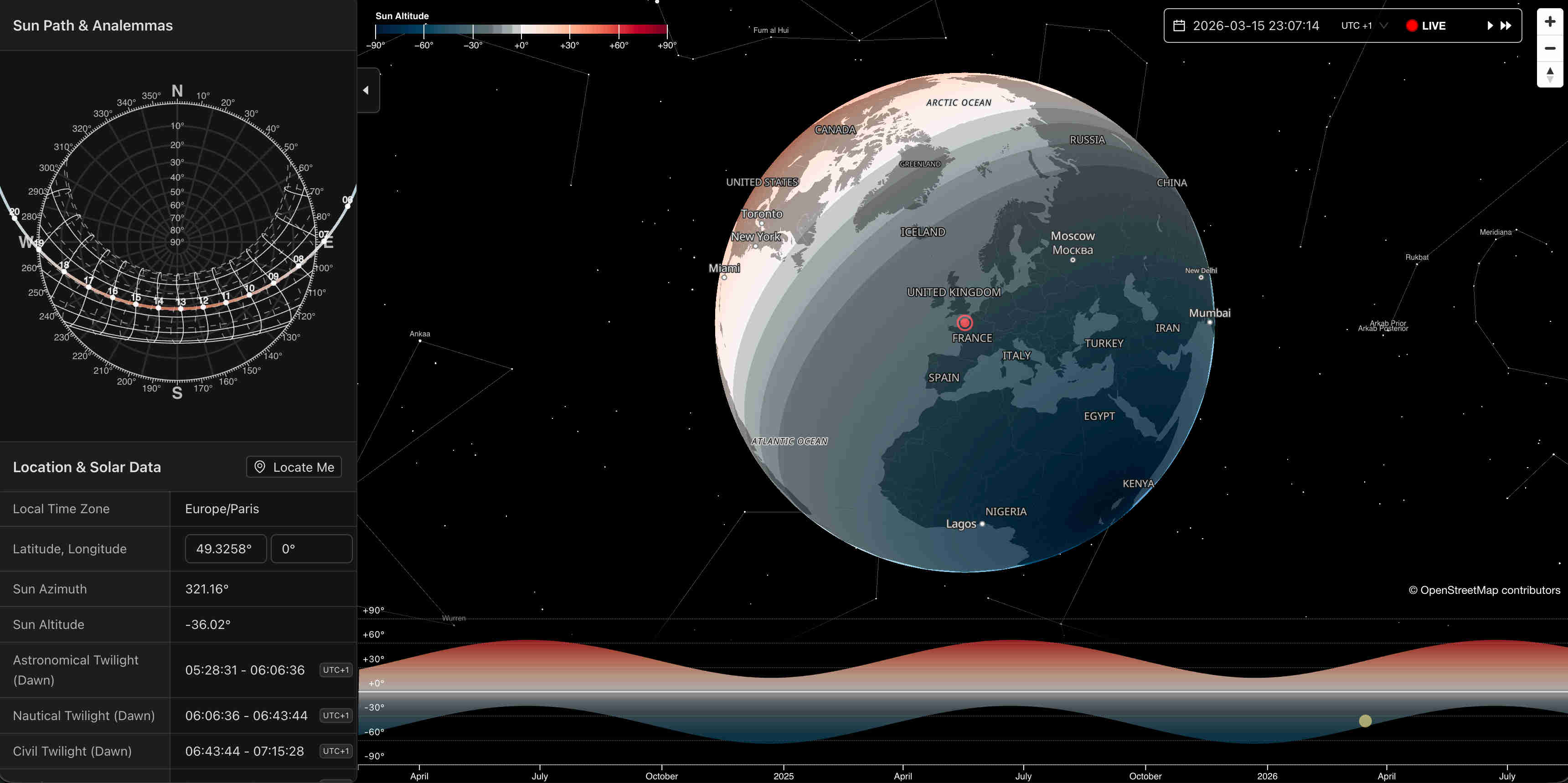 An interactive 3D map to visualize the sun path, star positions, constellations, sunrise, sunset and twilight zones across the globe in real time.